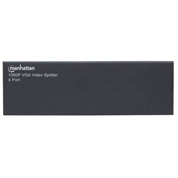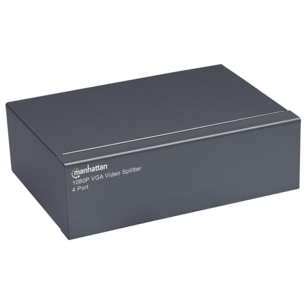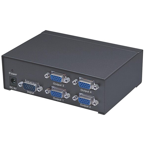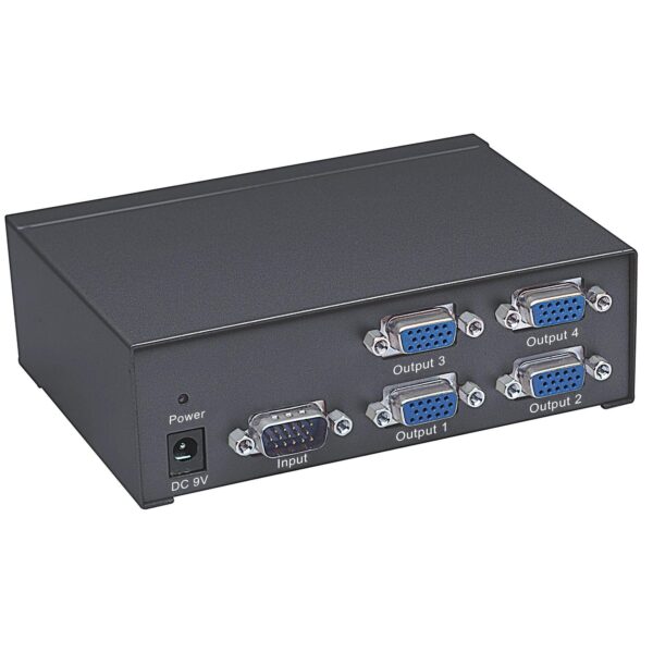 • Duplica un segnale video per quattro uscite VGA• Supporta la risoluzione 1080p• Larghezza di banda del segnale a 350 MHz• Connessioni HD15Standard e certificazioni• CE• FCC• ISO9002Informazioni generali• LED alimentazione• Distanza computer-splitter video: 7,5 m• Distanza splitter video-monitor: 50 m• Alimentazione: 9V DC/300 mA; cavo 1.6 mConnessioni• Una connessione HD15 maschio (ingresso)• Quattro connessioni HD15 femmina (uscite)Segnale• Supporto di segnale VGA, SVGA, Multisync• Larghezza di banda VGA: 350 MHz• Risoluzione VGA: 1920×1080• Voltaggio ingresso min/max: 0.5 V p-p / 1.0 V p-p• Impedenza ingresso/uscita: 75 Ohms• Frequenza orizzontale: 30 – 120 KHz• Frequenza verticale: 40 – 120 kHzInformazioni fisiche• Dimensioni: 54 x 208 x 104 mm• Peso: 700 g• Alloggiamento in metalloContenuto della confezione• Splitter video• Alimentatore• Istruzioni