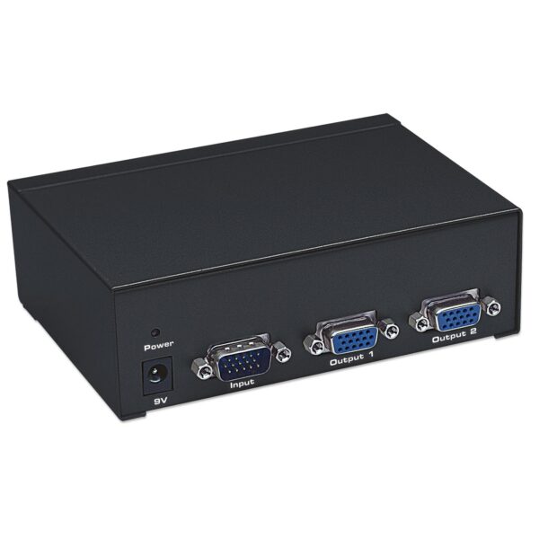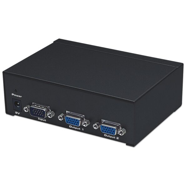 • Duplica un singolo segnale VGA fino a due uscite VGA• Supporta larghezza di banda fino a 350 MHz e risoluzioni fino a 1920 x 1680 con distanza di trasmissione effettiva fino a 65 m• Fornisce un segnale chiaro e limpido da un PC a monitor, proiettori o altre apparecchiature VGA, SVGA e MultiSync• Cascata fino a tre livelli per espandere la distribuzione del segnale a più monitor• La funzione di risparmio energetico si attiva automaticamente fino a quando il segnale VGA non viene ripristinato• Semplice da installare — non è richiesta alcuna configurazioneStandard e Certificazioni• FCC• CE• ISO9002Informazioni generali• Indicatore LED: Acceso (verde)• Lunghezza del cavo, massimo: 65 m • Connessione: ingresso: (1) HD15 maschio; uscita, (2) HD15 femmina• Alimentatore: 9 V AC, 300 mASegnale• Larghezza di banda del segnale: 350 MHz• Tipo di segnale: VGA, SVGA, multi-sync• Voltaggio in ingresso, minimo: 0.5 V p-p• Voltaggio in ingresso, massimo: 1.0 V p-p• Impedenza I/O: 75 OhmsRisoluzione• Risoluzione: 1920 x 1680• Frequenza orizzontale: 30 – 120 KHz• Frequenza verticale: 40 – 120 HzPorte• (1) HD15 maschio• (2) HD15 femmina• (1) porta per alimentazione 9 V, 1000 mAInformazioni fisiche:• Alloggiamento: metallo • Dimensioni: 133 x 94 x 42 mm• Peso: 396 gContenuto della confezione• Video Splitter Professionale • Alimentatore• Manuale d’istruzione