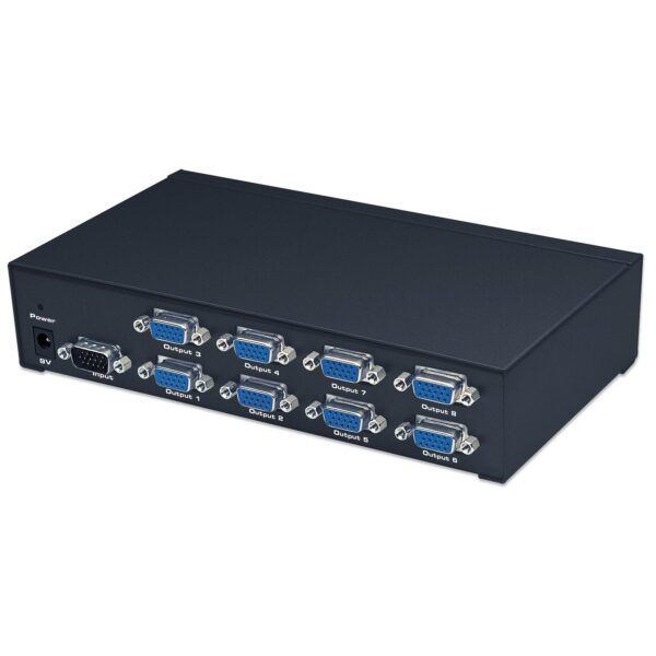 • Duplica un singolo segnale VGA fino a otto uscite VGA• Supporta larghezza di banda fino a 350 MHz e risoluzioni fino a 1920 x 1680 con distanza di trasmissione effettiva fino a 65 m• Fornisce un segnale chiaro e limpido da un PC a monitor, proiettori o altre apparecchiature VGA, SVGA e MultiSync• Cascata fino a tre livelli per espandere la distribuzione del segnale a più monitor• La funzione di risparmio energetico si attiva automaticamente fino a quando il segnale VGA non viene ripristinato• Semplice da installare — non è richiesta alcuna configurazioneStandard e Certificazioni• FCC• CE• ISO9002Informazioni generali• Indicatore LED: Acceso (verde)• Lunghezza del cavo, massimo: 65 m• Connessioni: ingresso, (1) HD15 maschio; uscita, (8) HD15 femmina• Alimentatore: 9 V AC, 300 mASegnale• Larghezza di banda del segnale: 350 MHz• Tipo di segnale: VGA, SVGA, multi-sync• Voltaggio in ingresso, minimo: 0.5 V p-p• Voltaggio in ingresso, massimo: 1.0 V p-p• Impedenza I/O: 75 OhmsRisoluzione• Risoluzione: 1920 x 1680• Frequenza orizzontale: 30 – 120 KHz• Frequenza verticale: 40 – 120 HzPorte• (1) HD15 maschio• (8) HD15 femmina• (1) porta per alimentazione 9 V, 1000 mAInformazioni fisiche• Alloggiamento: metallo• Dimensioni: 203 x 103 x 42 mm • Peso: 694 g Contenuto della confezione• Video Splitter Professionale• Manuale d’istruzione