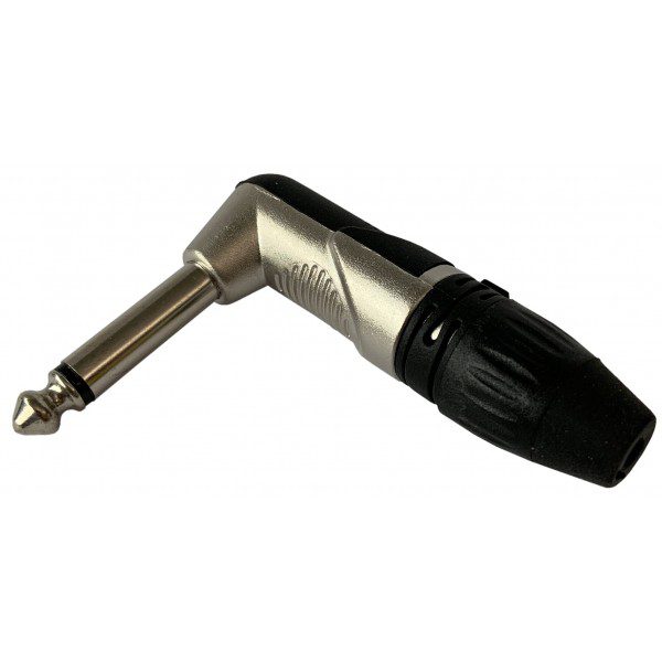 Connettore Jack da 6.35mm con robusto alloggiamento in metallo e fermacavo color nero con angolo a 90°