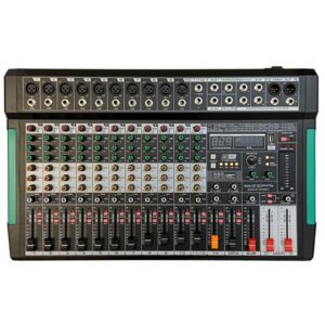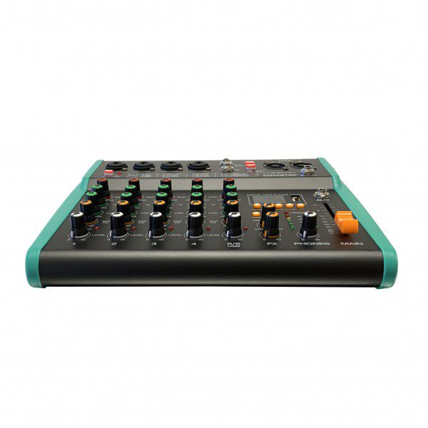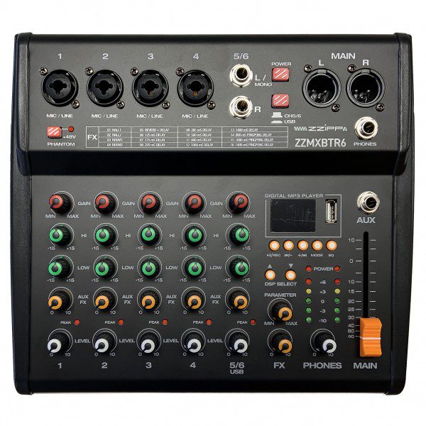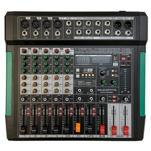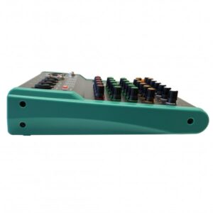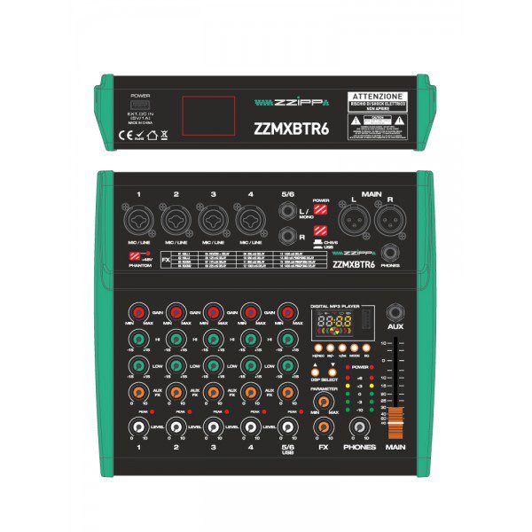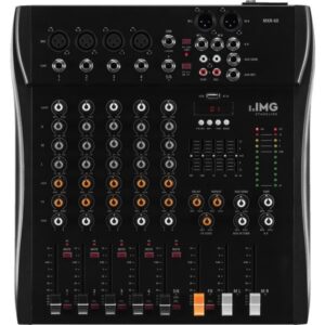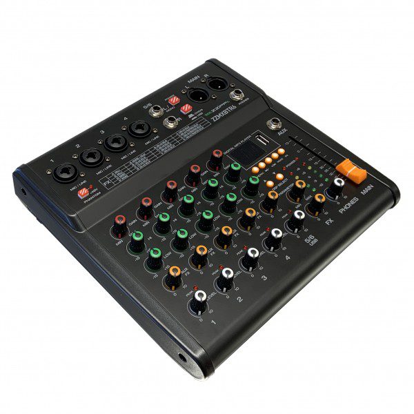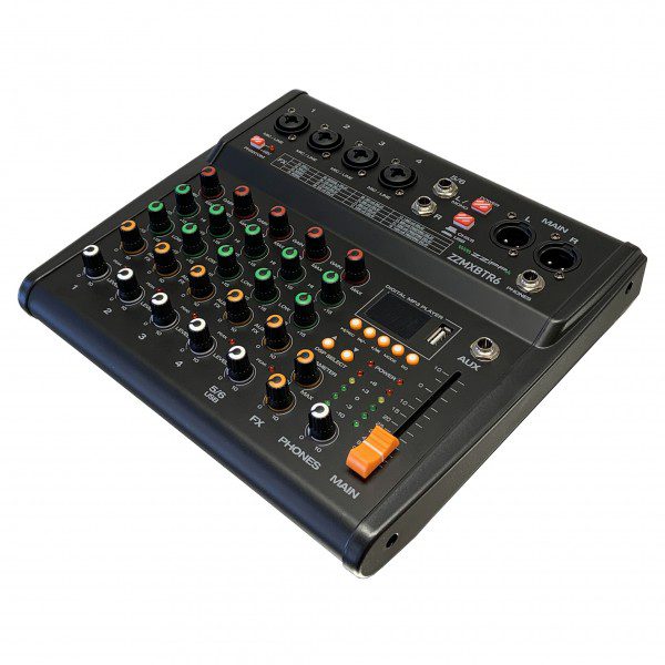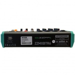 Mixer compatto con lettore mp3 integrato, connettività bluetooth e scheda audio.