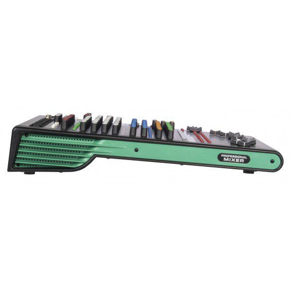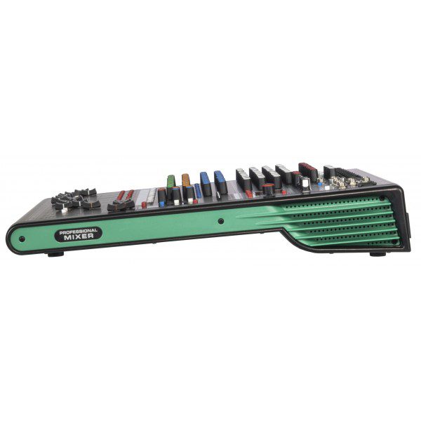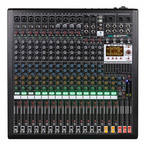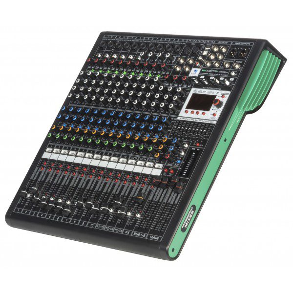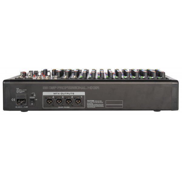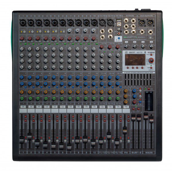 Mixer analogico compatto con DSP a 32 bit e scheda audio full duplex integrati, 99 effetti, connettività bluetooth e lettore multimediale. 4 gruppi di uscita ausiliari selezionabili indipendentemente, con selettore a matrice. Equalizzatore a 9 bande sul master. Alimentazione phantom +48V